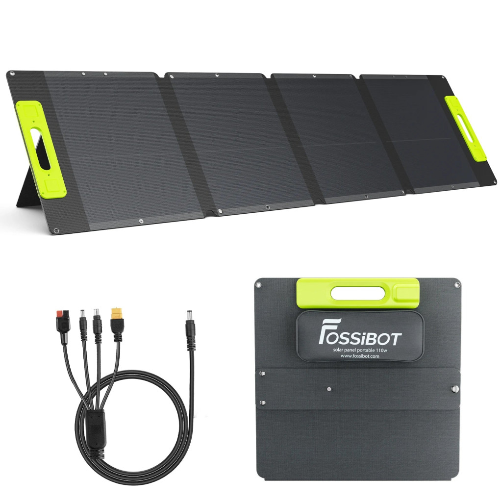 Ein langlebiges und effizientes faltbares 110 W Solarpanel zur Nutzung erneuerbarer Energien. Es ist leicht und tragbar und lässt sich nahtlos mit Fossibot-Kraftwerken für nachhaltige netzunabhängige Stromversorgungslösungen kombinieren.
